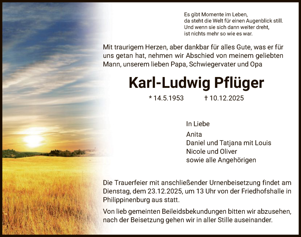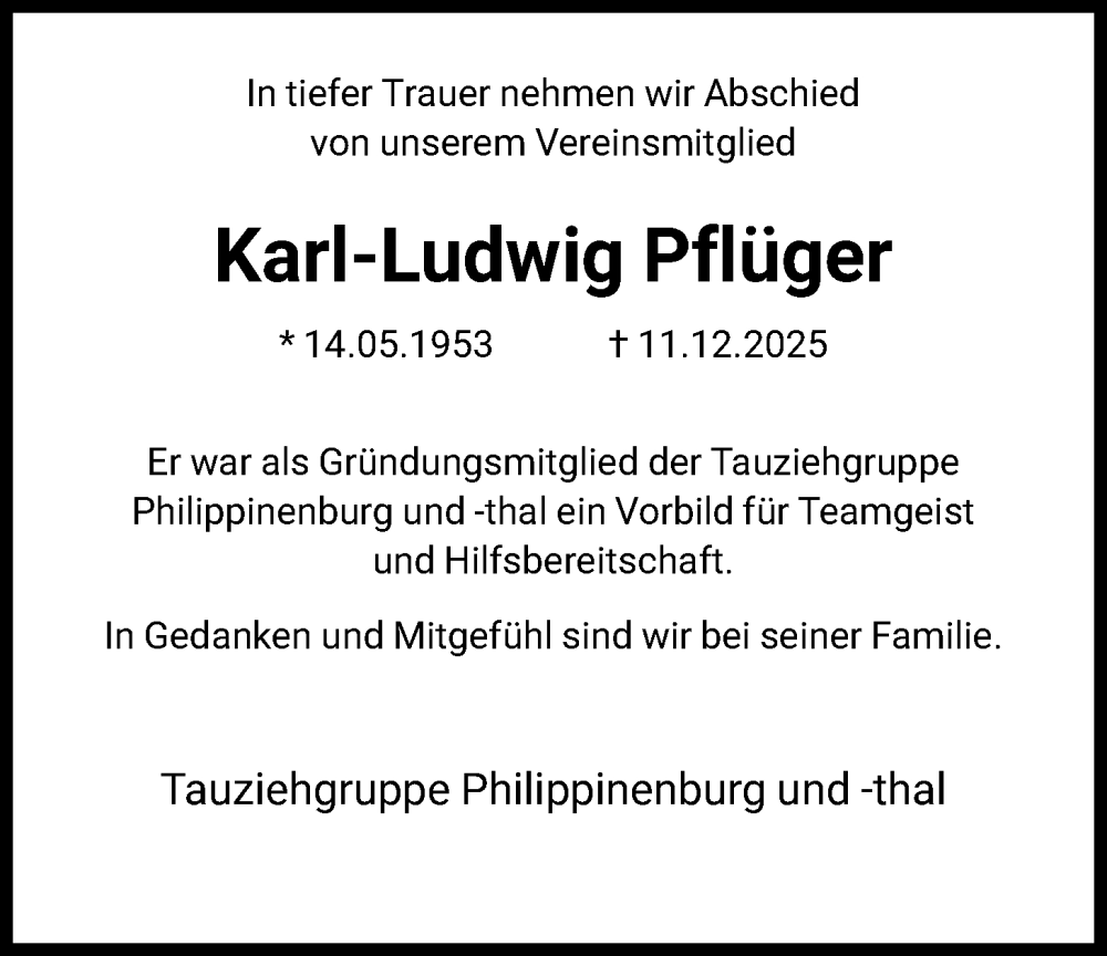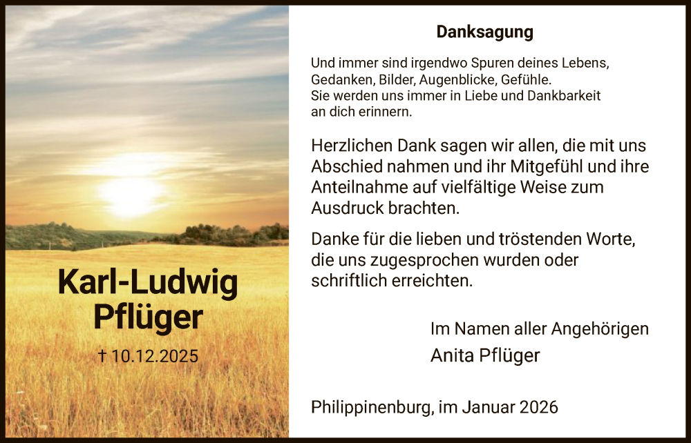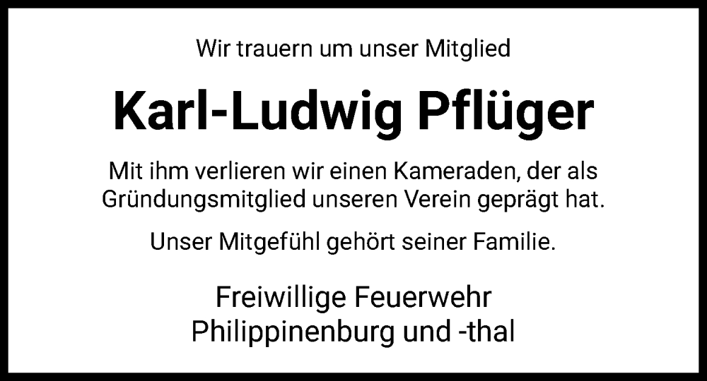 Hier finden Sie alle Traueranzeigen aus der Zeitung, die bisher für Karl-Ludwig Pflüger erschienen sind. Weitere Traueranzeigen, die in der Zeitung erscheinen, werden hier ebenfalls aufgelistet