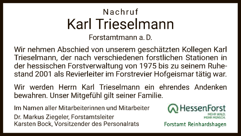 Hier finden Sie alle Traueranzeigen aus der Zeitung, die bisher für Karl Trieselmann erschienen sind. Weitere Traueranzeigen, die in der Zeitung erscheinen, werden hier ebenfalls aufgelistet