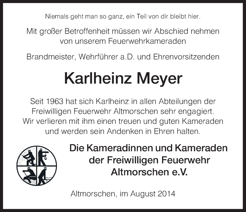 Hier finden Sie alle Traueranzeigen aus der Zeitung, die bisher für Karlheinz Meyer erschienen sind. Weitere Traueranzeigen, die in der Zeitung erscheinen, werden hier ebenfalls aufgelistet