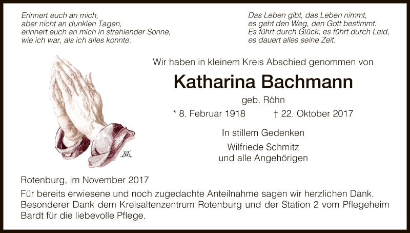 Hier finden Sie alle Traueranzeigen aus der Zeitung, die bisher für Katharina Bachmann erschienen sind. Weitere Traueranzeigen, die in der Zeitung erscheinen, werden hier ebenfalls aufgelistet