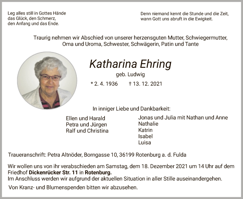 Hier finden Sie alle Traueranzeigen aus der Zeitung, die bisher für Katharina Ehring erschienen sind. Weitere Traueranzeigen, die in der Zeitung erscheinen, werden hier ebenfalls aufgelistet