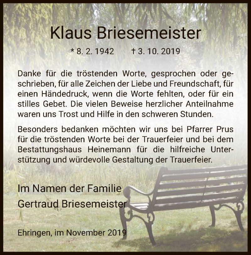 Hier finden Sie alle Traueranzeigen aus der Zeitung, die bisher für Klaus Briesemeister erschienen sind. Weitere Traueranzeigen, die in der Zeitung erscheinen, werden hier ebenfalls aufgelistet
