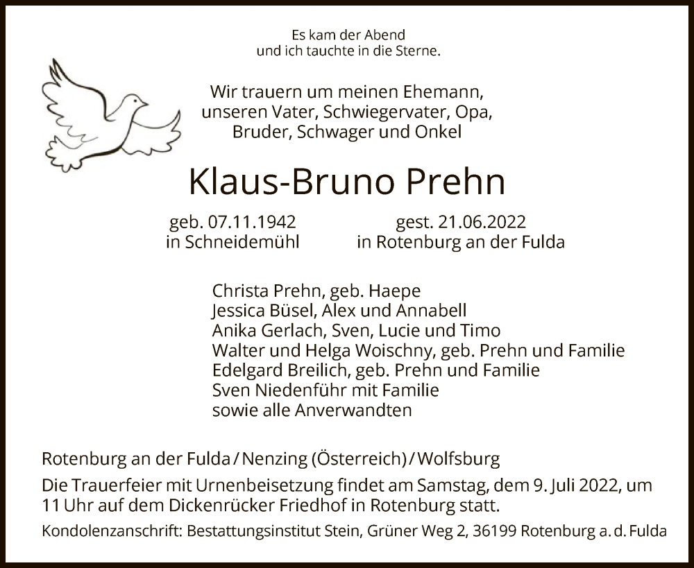 Hier finden Sie alle Traueranzeigen aus der Zeitung, die bisher für Klaus-Bruno Prehn erschienen sind. Weitere Traueranzeigen, die in der Zeitung erscheinen, werden hier ebenfalls aufgelistet