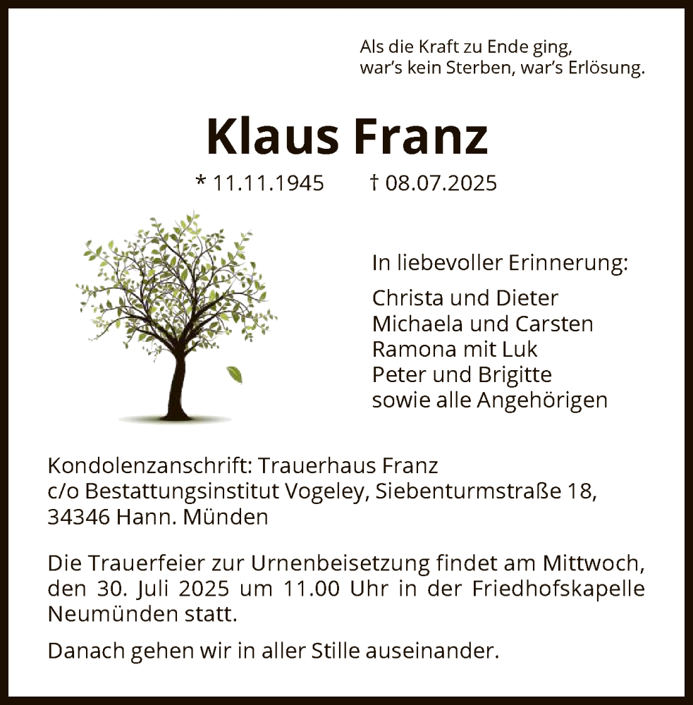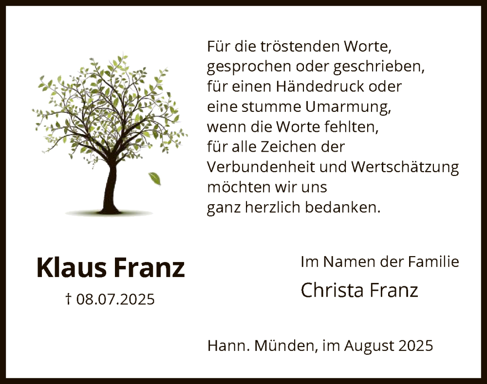 Hier finden Sie alle Traueranzeigen aus der Zeitung, die bisher für Klaus Franz erschienen sind. Weitere Traueranzeigen, die in der Zeitung erscheinen, werden hier ebenfalls aufgelistet