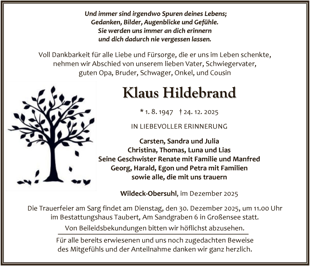Hier finden Sie alle Traueranzeigen aus der Zeitung, die bisher für Klaus Hildebrand erschienen sind. Weitere Traueranzeigen, die in der Zeitung erscheinen, werden hier ebenfalls aufgelistet