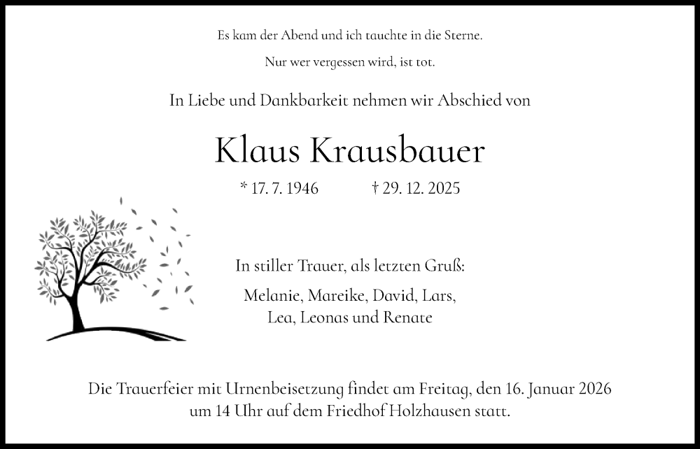 Hier finden Sie alle Traueranzeigen aus der Zeitung, die bisher für Klaus Krausbauer erschienen sind. Weitere Traueranzeigen, die in der Zeitung erscheinen, werden hier ebenfalls aufgelistet