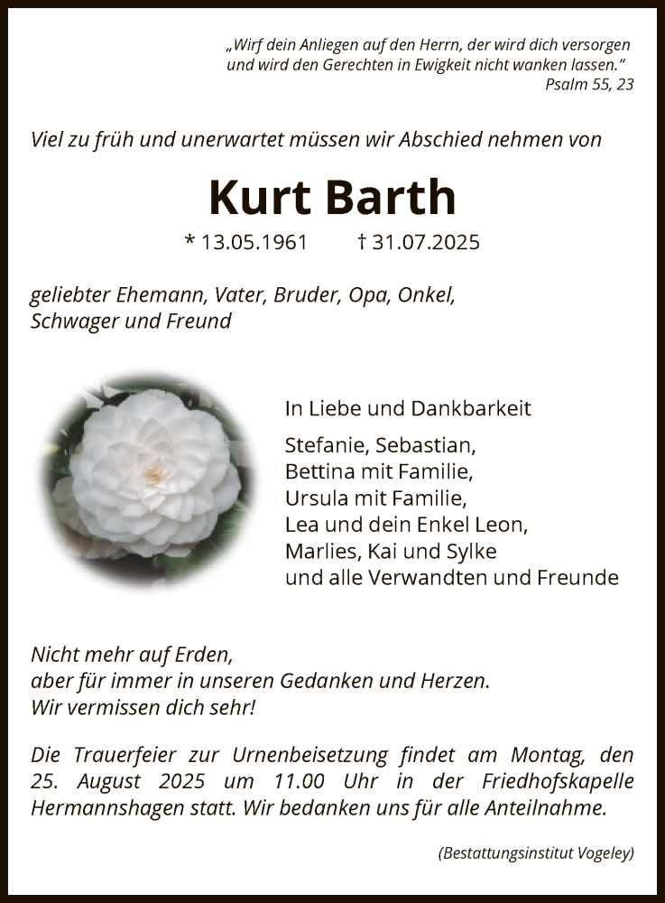 Hier finden Sie alle Traueranzeigen aus der Zeitung, die bisher für Kurt Barth erschienen sind. Weitere Traueranzeigen, die in der Zeitung erscheinen, werden hier ebenfalls aufgelistet