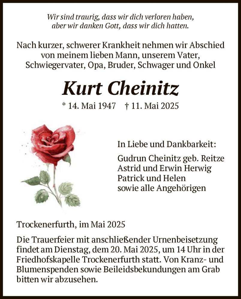Hier finden Sie alle Traueranzeigen aus der Zeitung, die bisher für Kurt Cheinitz erschienen sind. Weitere Traueranzeigen, die in der Zeitung erscheinen, werden hier ebenfalls aufgelistet