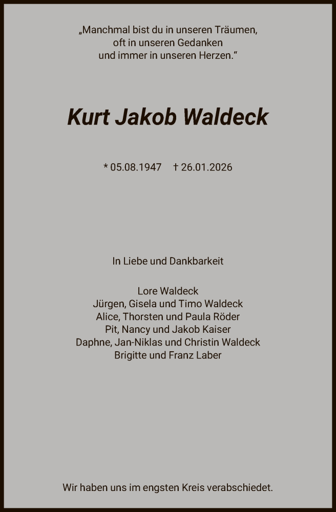 Hier finden Sie alle Traueranzeigen aus der Zeitung, die bisher für Kurt Jakob Waldeck erschienen sind. Weitere Traueranzeigen, die in der Zeitung erscheinen, werden hier ebenfalls aufgelistet