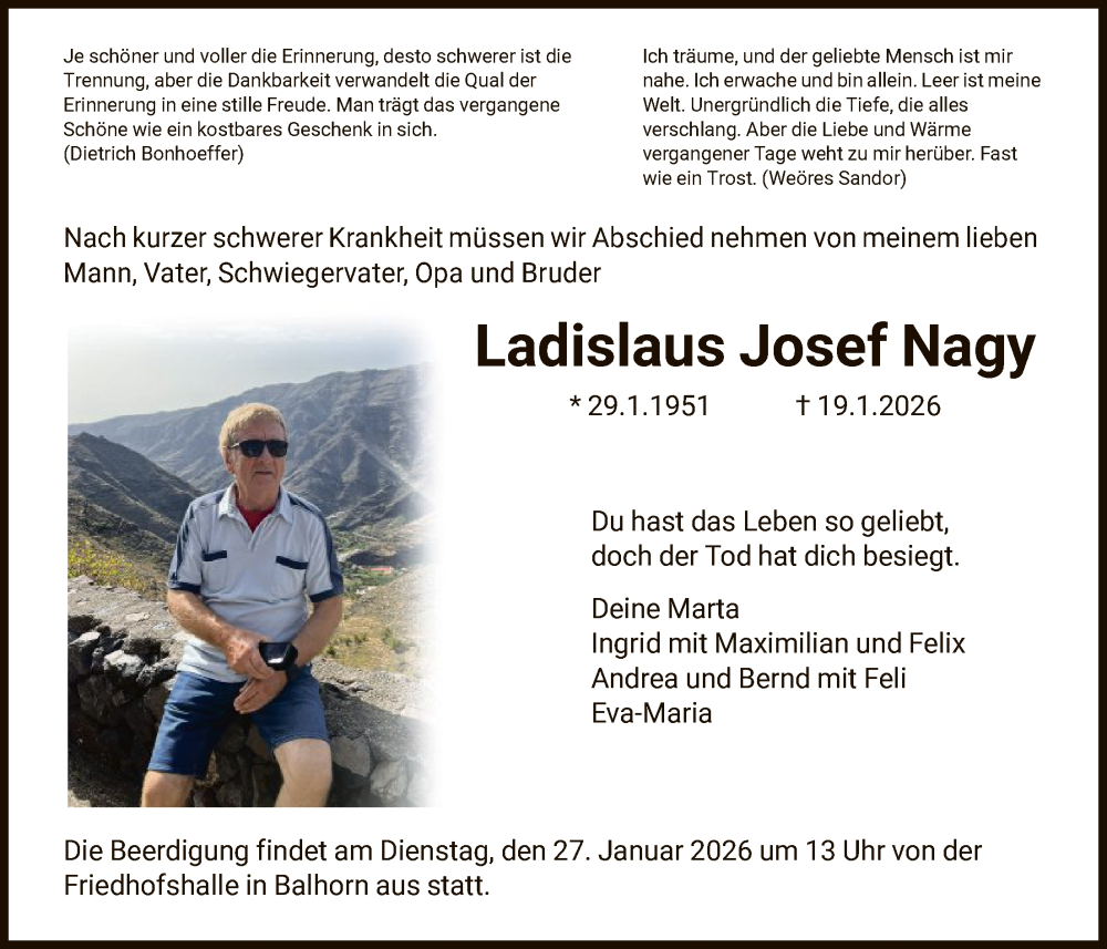 Hier finden Sie alle Traueranzeigen aus der Zeitung, die bisher für Ladislau Nagy erschienen sind. Weitere Traueranzeigen, die in der Zeitung erscheinen, werden hier ebenfalls aufgelistet