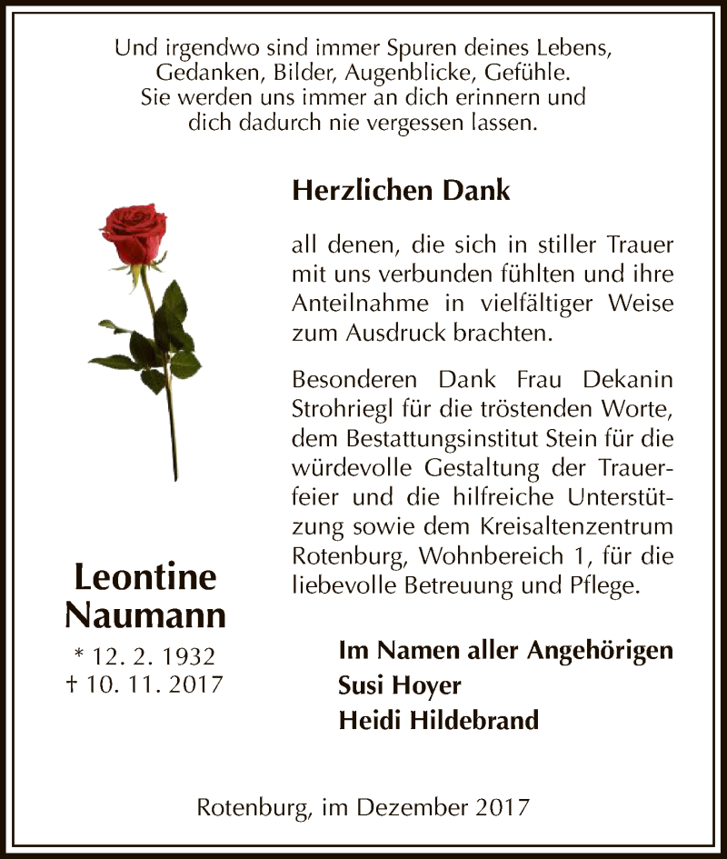Hier finden Sie alle Traueranzeigen aus der Zeitung, die bisher für Leontine Naumann erschienen sind. Weitere Traueranzeigen, die in der Zeitung erscheinen, werden hier ebenfalls aufgelistet