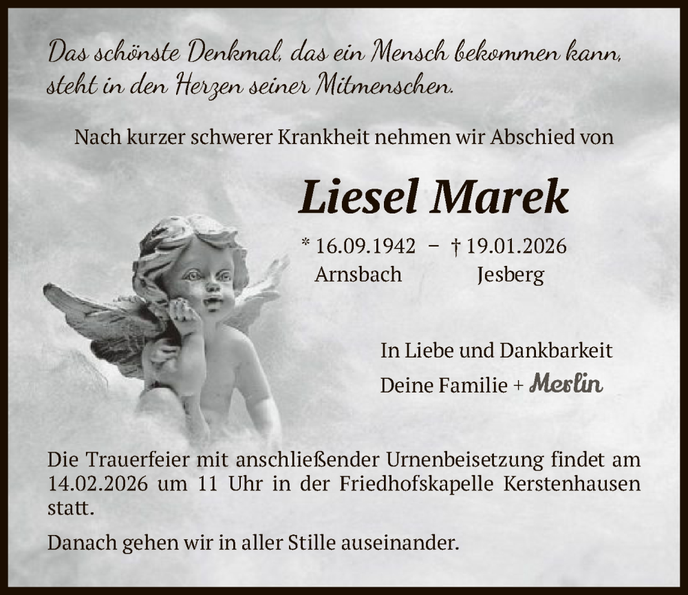 Hier finden Sie alle Traueranzeigen aus der Zeitung, die bisher für Liesel Marek erschienen sind. Weitere Traueranzeigen, die in der Zeitung erscheinen, werden hier ebenfalls aufgelistet