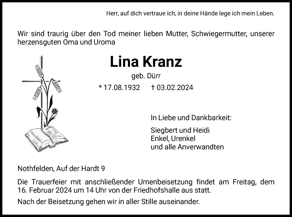 Hier finden Sie alle Traueranzeigen aus der Zeitung, die bisher für Lina Kranz erschienen sind. Weitere Traueranzeigen, die in der Zeitung erscheinen, werden hier ebenfalls aufgelistet