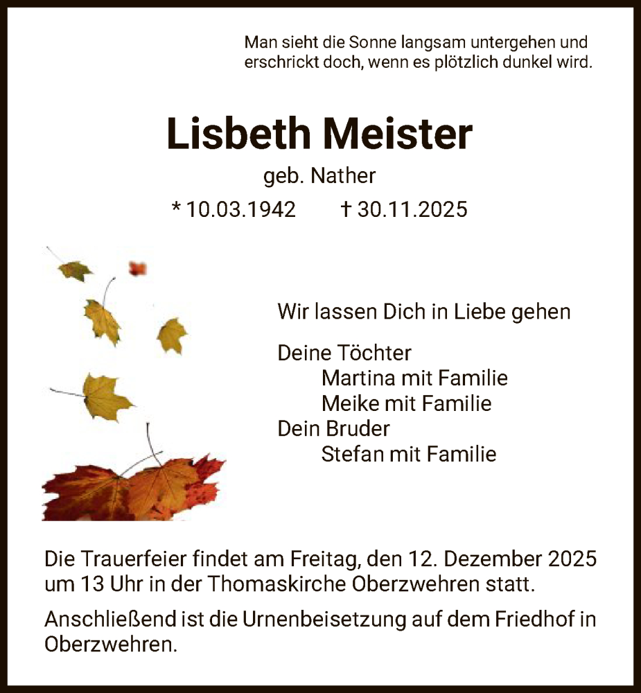Hier finden Sie alle Traueranzeigen aus der Zeitung, die bisher für Lisbeth Meister erschienen sind. Weitere Traueranzeigen, die in der Zeitung erscheinen, werden hier ebenfalls aufgelistet