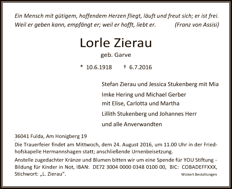 Hier finden Sie alle Traueranzeigen aus der Zeitung, die bisher für Lorle Zierau erschienen sind. Weitere Traueranzeigen, die in der Zeitung erscheinen, werden hier ebenfalls aufgelistet