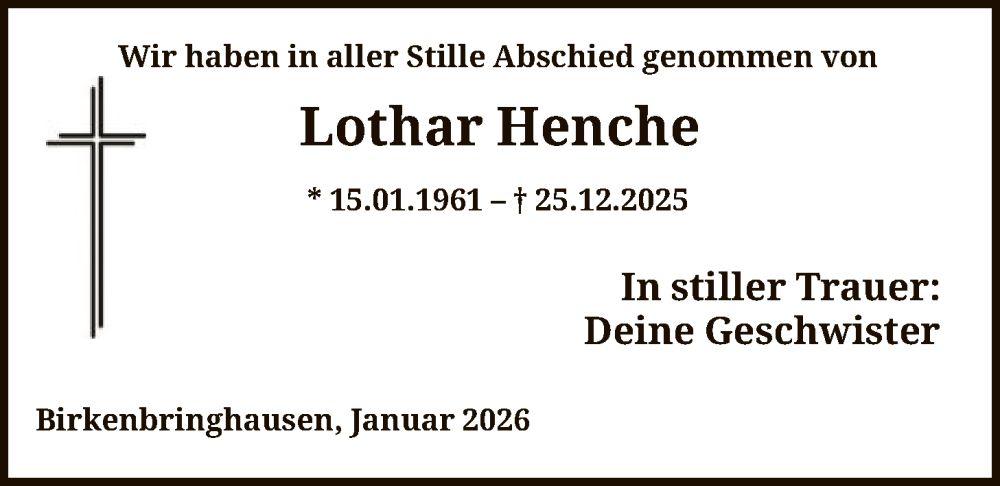 Hier finden Sie alle Traueranzeigen aus der Zeitung, die bisher für Lothar Henche erschienen sind. Weitere Traueranzeigen, die in der Zeitung erscheinen, werden hier ebenfalls aufgelistet