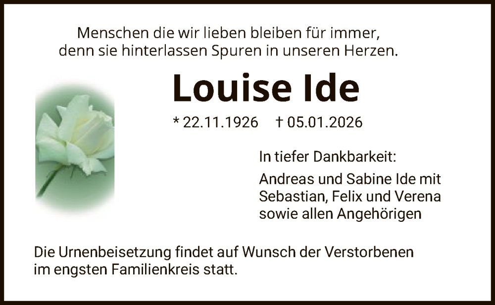 Hier finden Sie alle Traueranzeigen aus der Zeitung, die bisher für Louise Ide erschienen sind. Weitere Traueranzeigen, die in der Zeitung erscheinen, werden hier ebenfalls aufgelistet