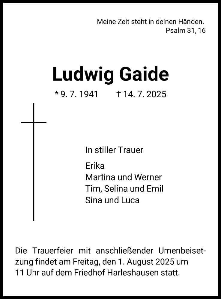 Hier finden Sie alle Traueranzeigen aus der Zeitung, die bisher für Ludwig Gaide erschienen sind. Weitere Traueranzeigen, die in der Zeitung erscheinen, werden hier ebenfalls aufgelistet