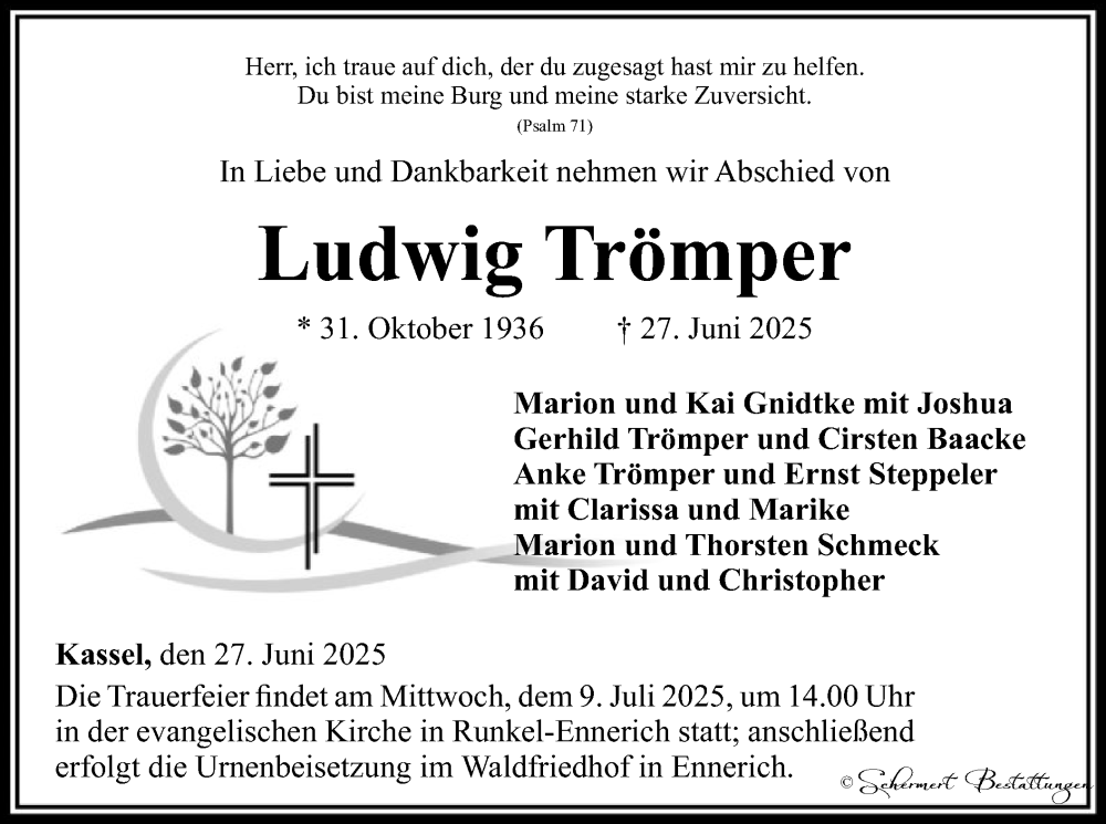 Hier finden Sie alle Traueranzeigen aus der Zeitung, die bisher für Ludwig Trömper erschienen sind. Weitere Traueranzeigen, die in der Zeitung erscheinen, werden hier ebenfalls aufgelistet