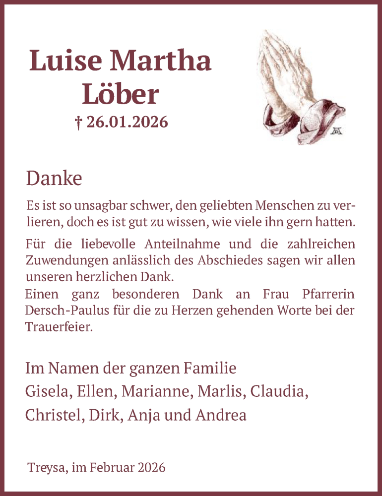 Hier finden Sie alle Traueranzeigen aus der Zeitung, die bisher für Luise Martha Löber erschienen sind. Weitere Traueranzeigen, die in der Zeitung erscheinen, werden hier ebenfalls aufgelistet