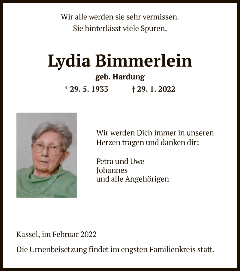 Hier finden Sie alle Traueranzeigen aus der Zeitung, die bisher für Lydia Bimmerlein erschienen sind. Weitere Traueranzeigen, die in der Zeitung erscheinen, werden hier ebenfalls aufgelistet