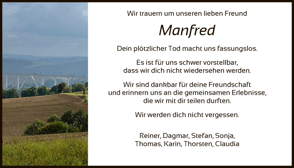 Hier finden Sie alle Traueranzeigen aus der Zeitung, die bisher für Manfred George erschienen sind. Weitere Traueranzeigen, die in der Zeitung erscheinen, werden hier ebenfalls aufgelistet