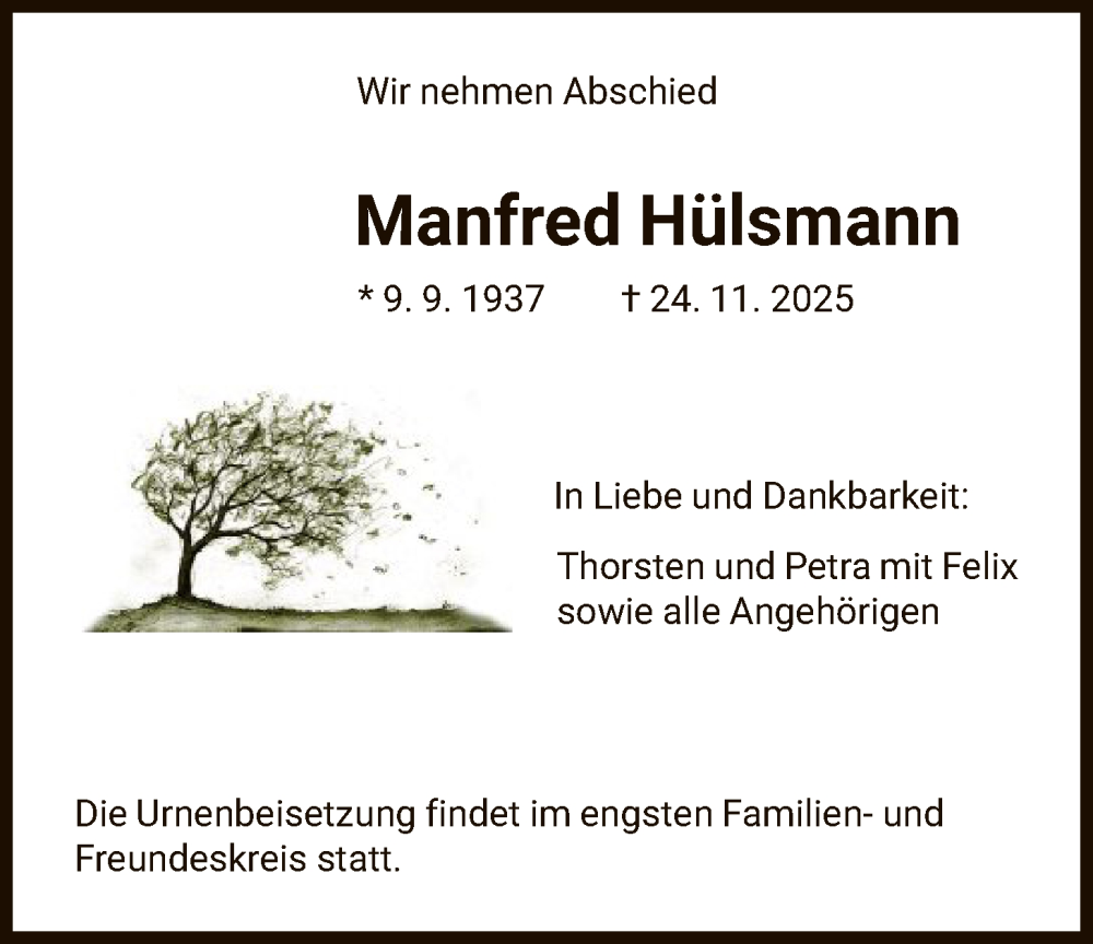 Hier finden Sie alle Traueranzeigen aus der Zeitung, die bisher für Manfred Hülsmann erschienen sind. Weitere Traueranzeigen, die in der Zeitung erscheinen, werden hier ebenfalls aufgelistet