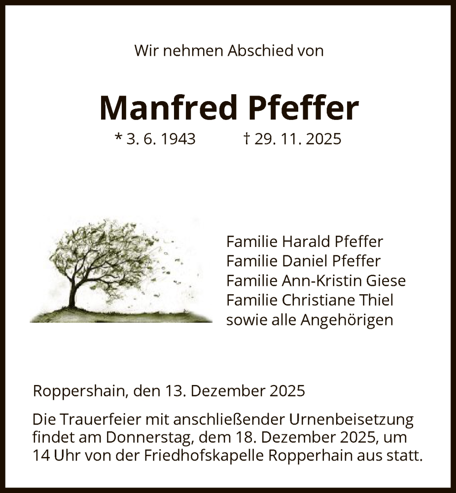 Hier finden Sie alle Traueranzeigen aus der Zeitung, die bisher für Manfred Pfeffer erschienen sind. Weitere Traueranzeigen, die in der Zeitung erscheinen, werden hier ebenfalls aufgelistet