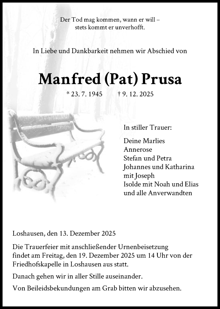 Hier finden Sie alle Traueranzeigen aus der Zeitung, die bisher für Manfred Prusa erschienen sind. Weitere Traueranzeigen, die in der Zeitung erscheinen, werden hier ebenfalls aufgelistet