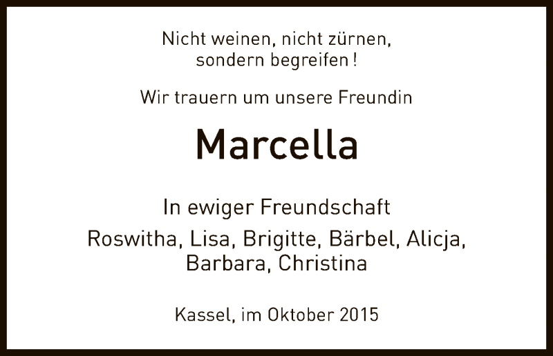 Hier finden Sie alle Traueranzeigen aus der Zeitung, die bisher für Marcella erschienen sind. Weitere Traueranzeigen, die in der Zeitung erscheinen, werden hier ebenfalls aufgelistet