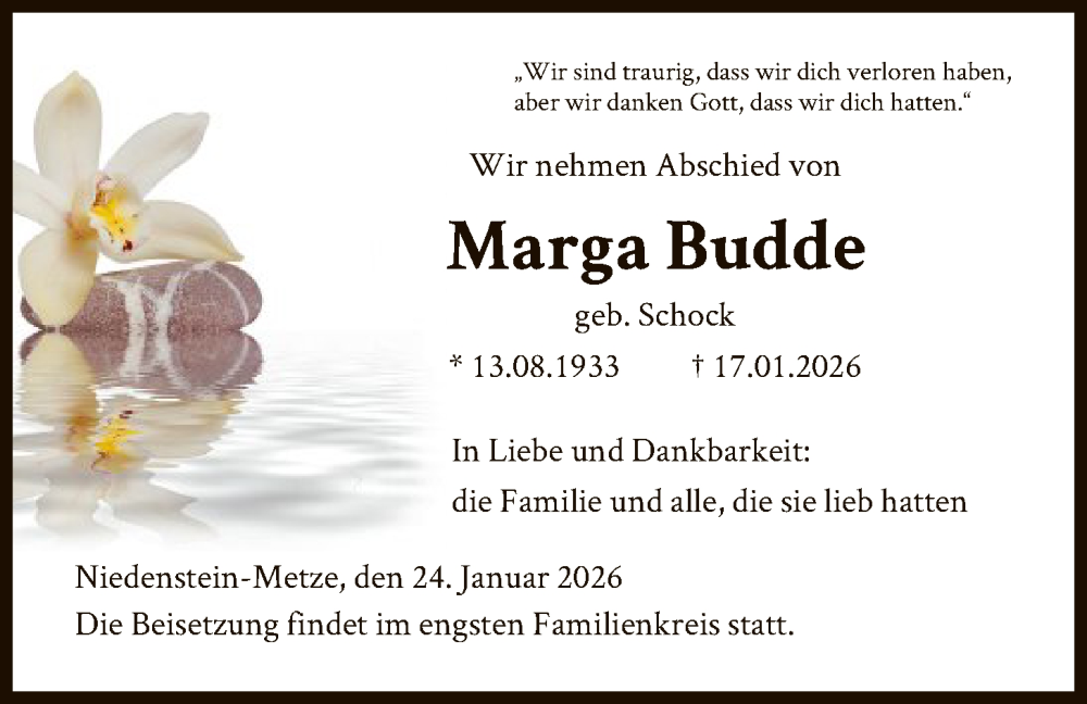Hier finden Sie alle Traueranzeigen aus der Zeitung, die bisher für Marga Budde erschienen sind. Weitere Traueranzeigen, die in der Zeitung erscheinen, werden hier ebenfalls aufgelistet