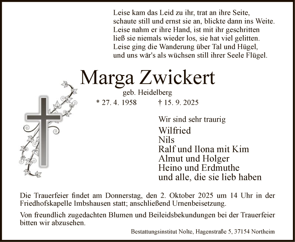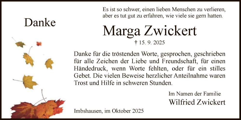 Hier finden Sie alle Traueranzeigen aus der Zeitung, die bisher für Marga Zwickert erschienen sind. Weitere Traueranzeigen, die in der Zeitung erscheinen, werden hier ebenfalls aufgelistet