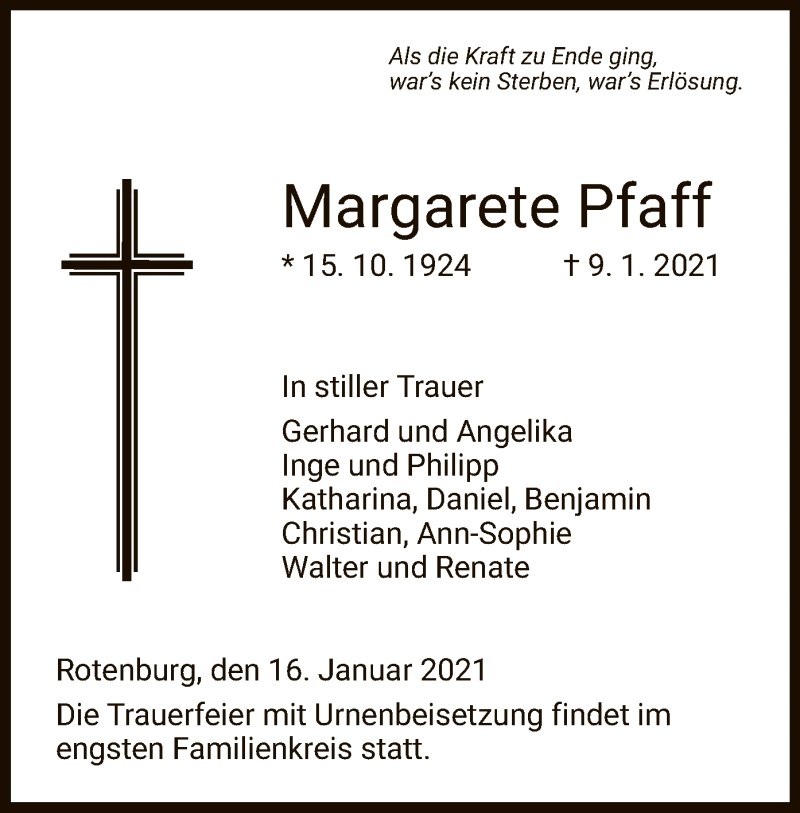 Hier finden Sie alle Traueranzeigen aus der Zeitung, die bisher für Margarete Pfaff erschienen sind. Weitere Traueranzeigen, die in der Zeitung erscheinen, werden hier ebenfalls aufgelistet
