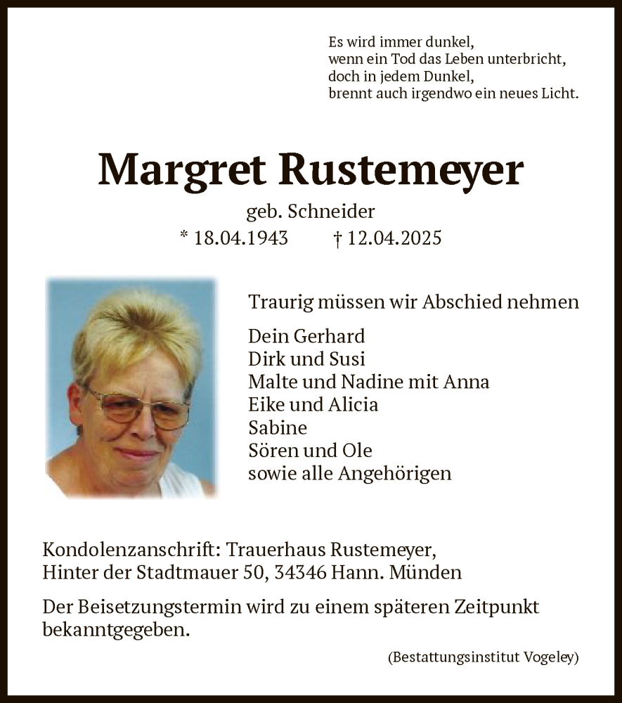 Hier finden Sie alle Traueranzeigen aus der Zeitung, die bisher für Margret Rustemeyer erschienen sind. Weitere Traueranzeigen, die in der Zeitung erscheinen, werden hier ebenfalls aufgelistet