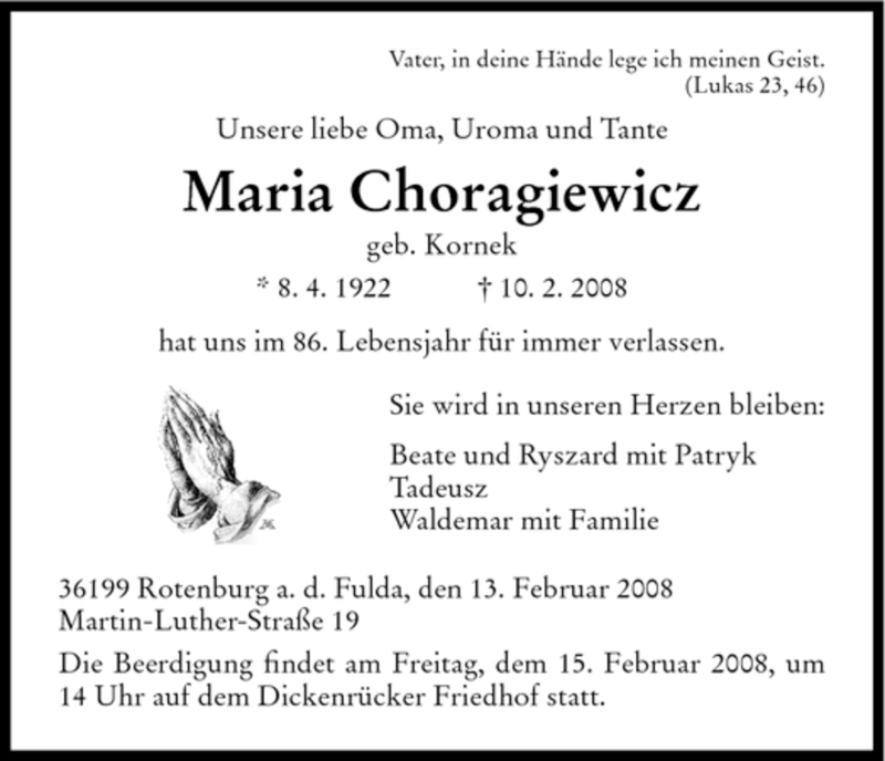 Hier finden Sie alle Traueranzeigen aus der Zeitung, die bisher für Maria Choragiewicz erschienen sind. Weitere Traueranzeigen, die in der Zeitung erscheinen, werden hier ebenfalls aufgelistet