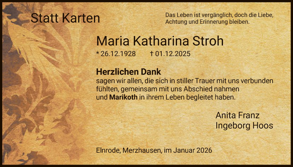 Hier finden Sie alle Traueranzeigen aus der Zeitung, die bisher für Maria Katharina Stroh erschienen sind. Weitere Traueranzeigen, die in der Zeitung erscheinen, werden hier ebenfalls aufgelistet