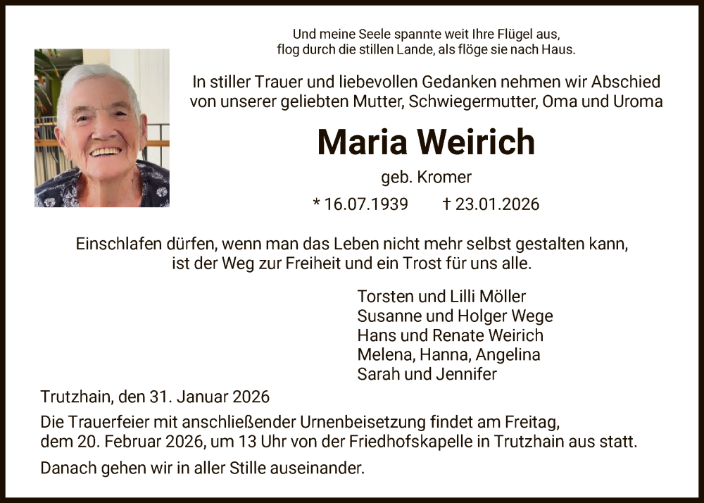 Hier finden Sie alle Traueranzeigen aus der Zeitung, die bisher für Maria Weirich erschienen sind. Weitere Traueranzeigen, die in der Zeitung erscheinen, werden hier ebenfalls aufgelistet