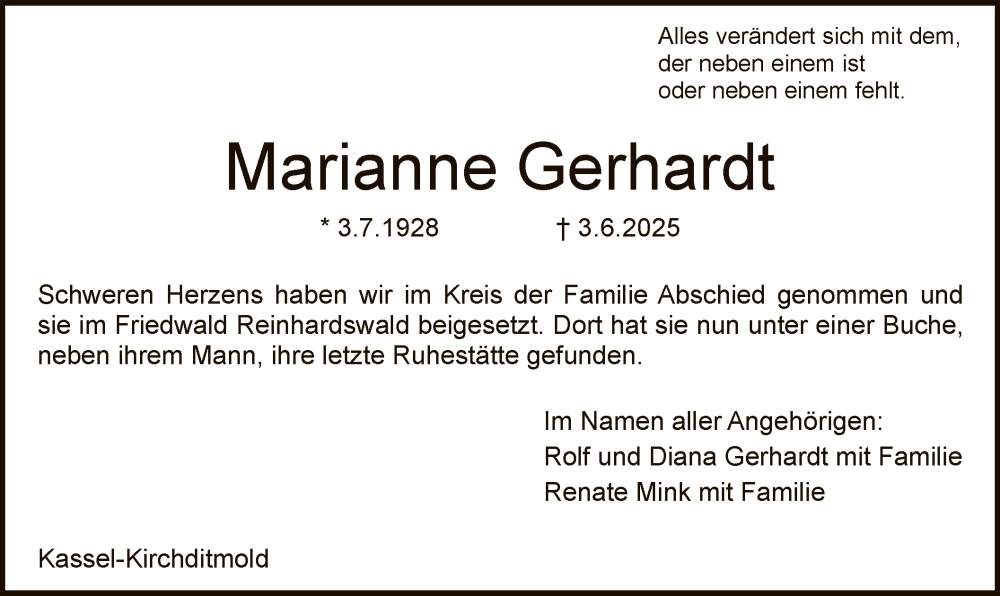 Hier finden Sie alle Traueranzeigen aus der Zeitung, die bisher für Marianne Gerhardt erschienen sind. Weitere Traueranzeigen, die in der Zeitung erscheinen, werden hier ebenfalls aufgelistet