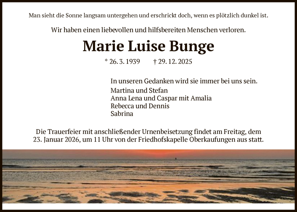 Hier finden Sie alle Traueranzeigen aus der Zeitung, die bisher für Marie Luise Bunge erschienen sind. Weitere Traueranzeigen, die in der Zeitung erscheinen, werden hier ebenfalls aufgelistet