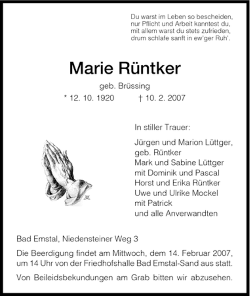 Hier finden Sie alle Traueranzeigen aus der Zeitung, die bisher für Marie Ruentker erschienen sind. Weitere Traueranzeigen, die in der Zeitung erscheinen, werden hier ebenfalls aufgelistet