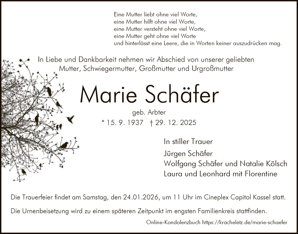 Hier finden Sie alle Traueranzeigen aus der Zeitung, die bisher für Marie Schäfer erschienen sind. Weitere Traueranzeigen, die in der Zeitung erscheinen, werden hier ebenfalls aufgelistet