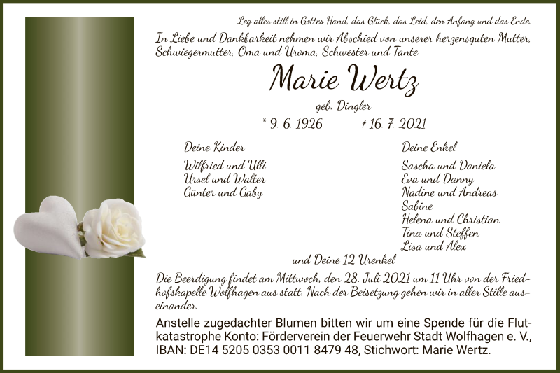 Hier finden Sie alle Traueranzeigen aus der Zeitung, die bisher für Marie Wertz erschienen sind. Weitere Traueranzeigen, die in der Zeitung erscheinen, werden hier ebenfalls aufgelistet