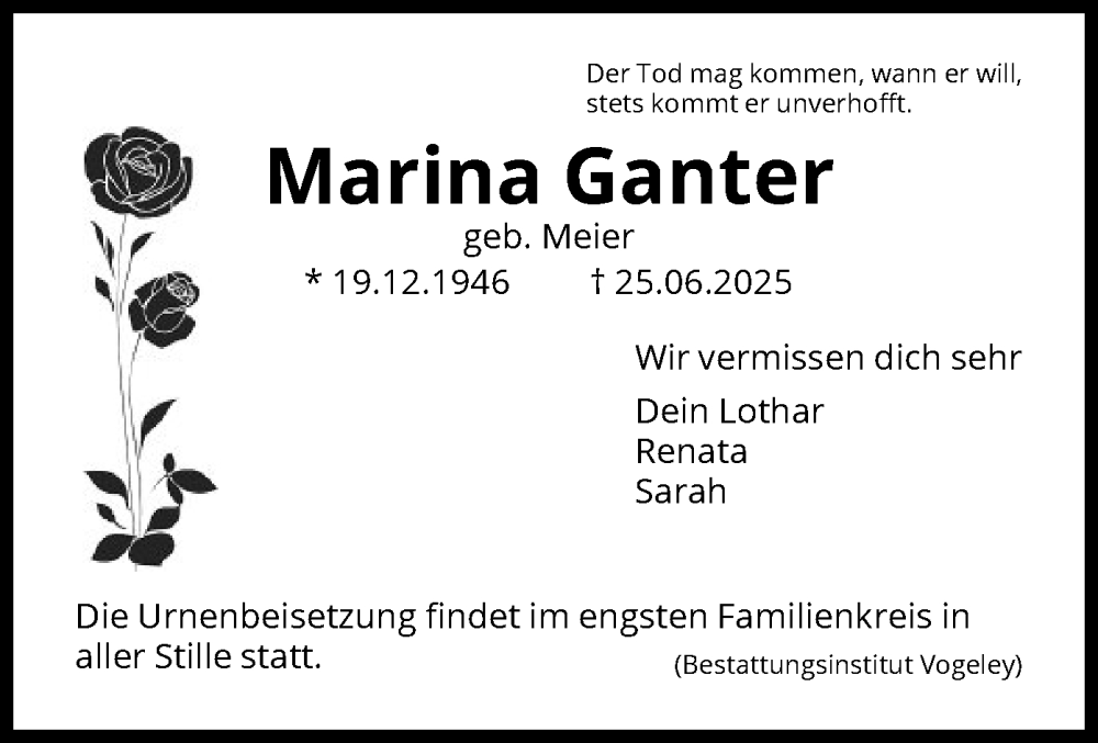 Hier finden Sie alle Traueranzeigen aus der Zeitung, die bisher für Marina Ganter erschienen sind. Weitere Traueranzeigen, die in der Zeitung erscheinen, werden hier ebenfalls aufgelistet