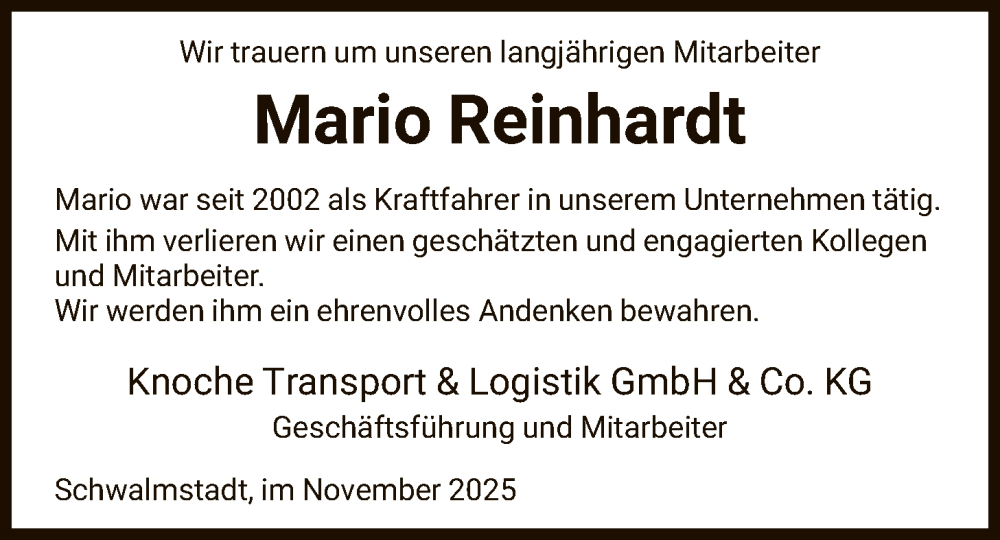 Hier finden Sie alle Traueranzeigen aus der Zeitung, die bisher für Mario Reinhardt erschienen sind. Weitere Traueranzeigen, die in der Zeitung erscheinen, werden hier ebenfalls aufgelistet