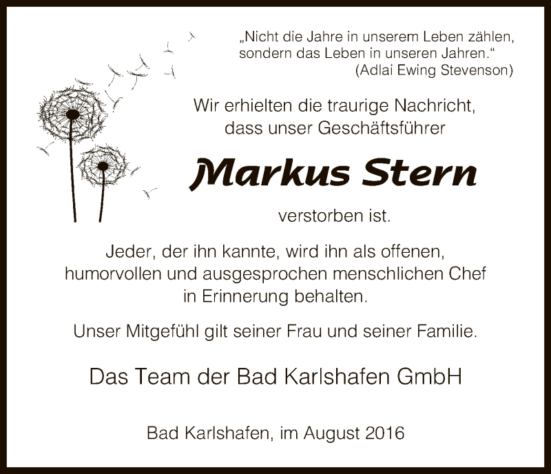 Hier finden Sie alle Traueranzeigen aus der Zeitung, die bisher für Markus Stern erschienen sind. Weitere Traueranzeigen, die in der Zeitung erscheinen, werden hier ebenfalls aufgelistet