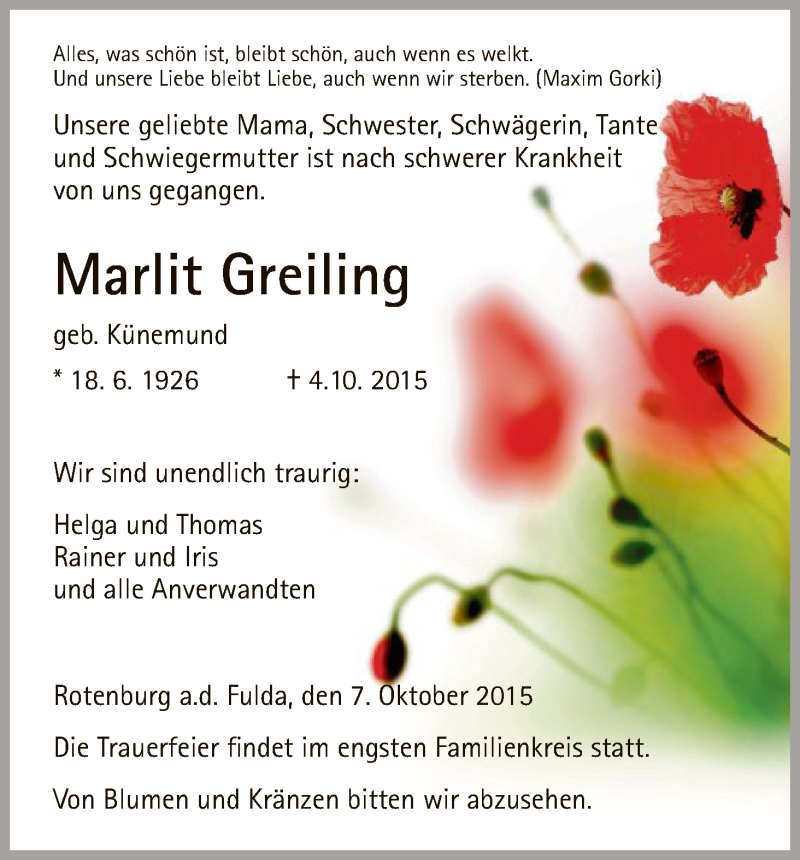 Hier finden Sie alle Traueranzeigen aus der Zeitung, die bisher für Marlit Greiing erschienen sind. Weitere Traueranzeigen, die in der Zeitung erscheinen, werden hier ebenfalls aufgelistet