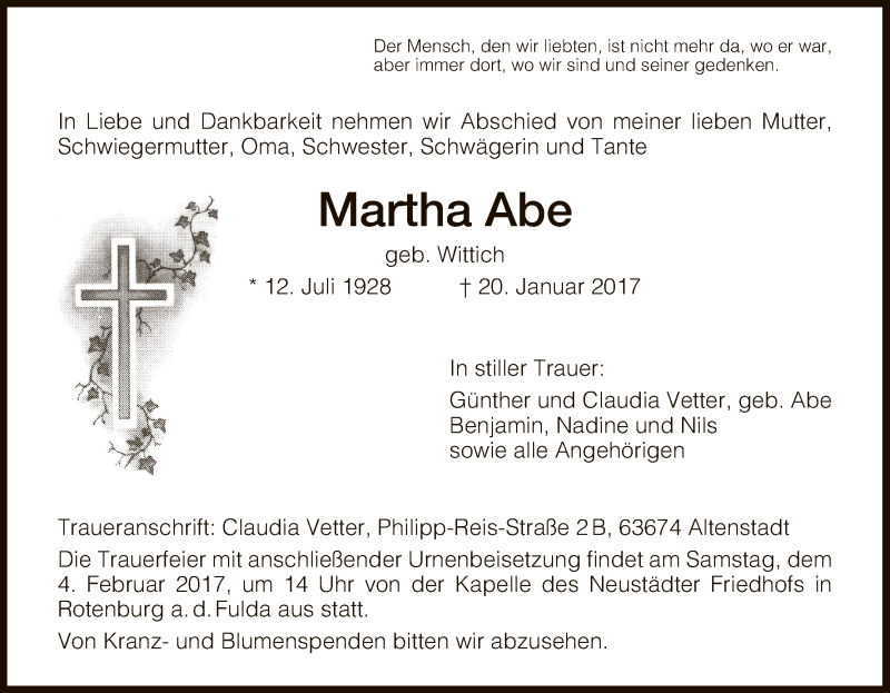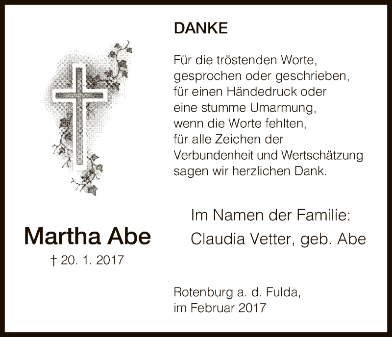 Hier finden Sie alle Traueranzeigen aus der Zeitung, die bisher für Martha Abe erschienen sind. Weitere Traueranzeigen, die in der Zeitung erscheinen, werden hier ebenfalls aufgelistet