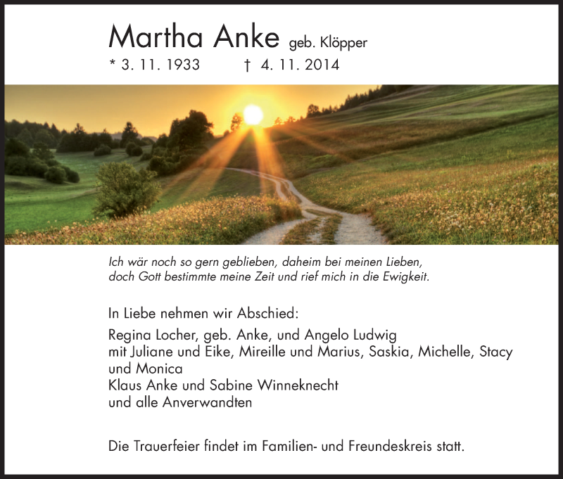 Hier finden Sie alle Traueranzeigen aus der Zeitung, die bisher für Martha Anke erschienen sind. Weitere Traueranzeigen, die in der Zeitung erscheinen, werden hier ebenfalls aufgelistet