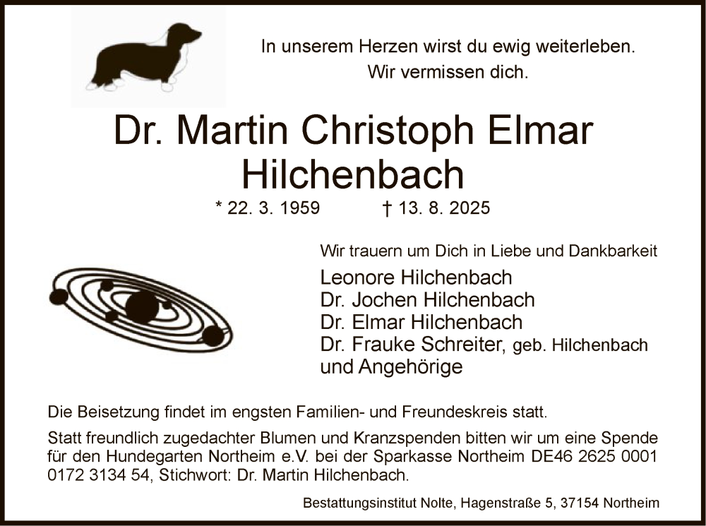 Hier finden Sie alle Traueranzeigen aus der Zeitung, die bisher für Martin Christoph Elmar Hilchenbach erschienen sind. Weitere Traueranzeigen, die in der Zeitung erscheinen, werden hier ebenfalls aufgelistet