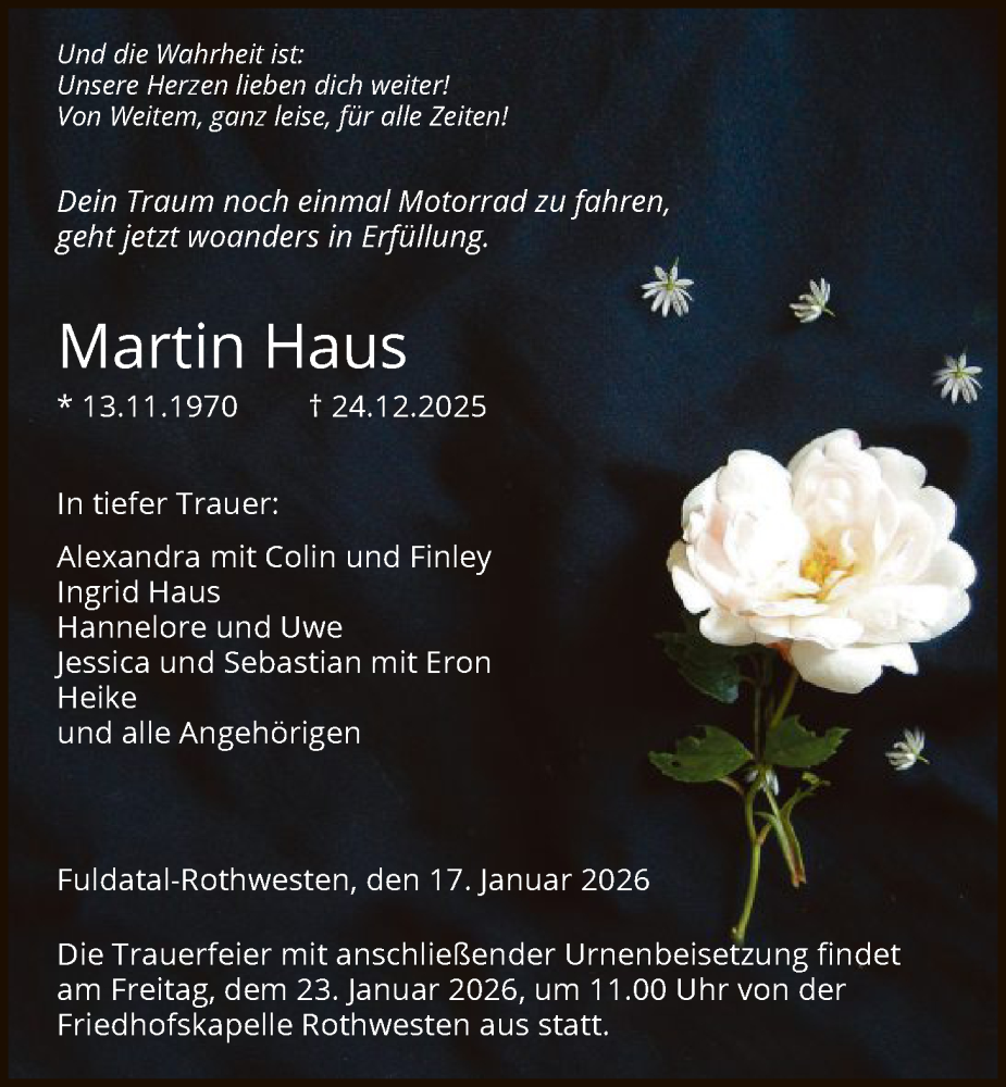 Hier finden Sie alle Traueranzeigen aus der Zeitung, die bisher für Martin Haus erschienen sind. Weitere Traueranzeigen, die in der Zeitung erscheinen, werden hier ebenfalls aufgelistet